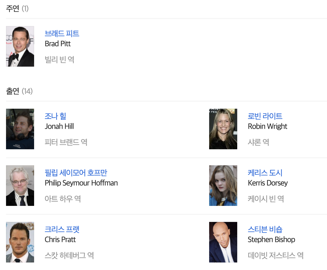 배우: 브래드 피트, 요나 힐, 필립 세이모어 호프만