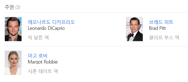 각종 시상식에서 디카프리오에 대한 찬사를 빼놓지 않은 브래드 피트의 수상 소감을 보면, 두 배우가 얼마나 서로를 존중하며 연기했는지 알 수가 있다. 영화에서 둘은 반짝반짝 빛나는 스타가 아닌, 한물간 배우와 대역 스턴트맨 역할을 완벽히 수행하며 지난날의 추억을 회상하려는 감독의 의도를 200% 완벽하게 수행한다. 정말 최고의 배우들이다.