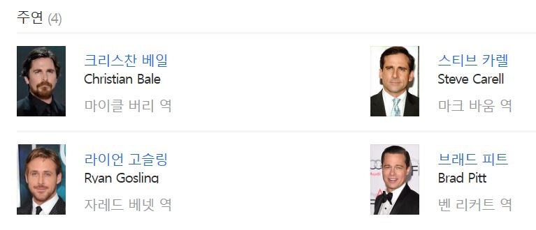 배우: 크리스찬 베일, 스티브 카렐, 라이언 고슬링, 브래드 피트